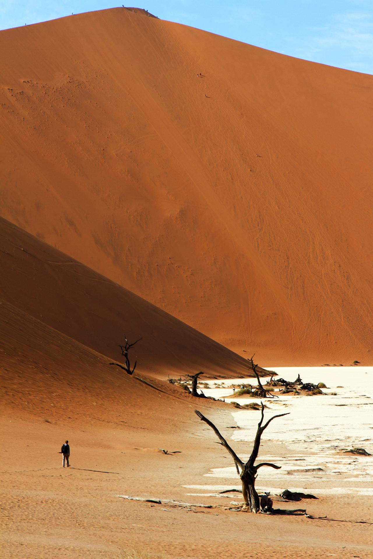 Deadvlei mélyen elrejtőző katlanában, a vörös dűne tövében, fehér agyagba merevedett, kiszáradt fekete fák ágaskodnak esdeklően az ég felé közel egy évezrede.