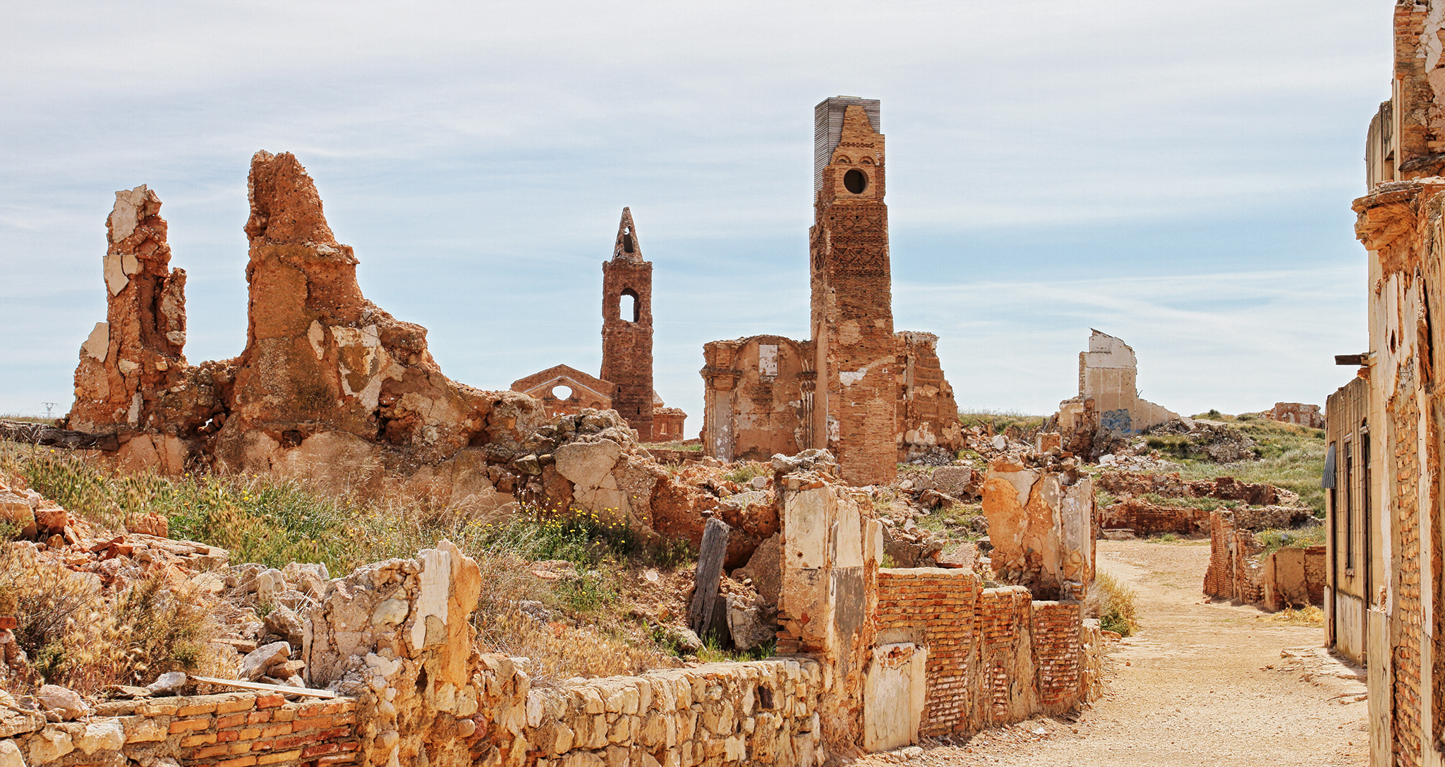 A XIV. századi, mór elemeket magába építő mudejár stílusú San Martín de Tours templom elkeseredett makacssággal még mindig magasba emelkedő romjai nem hagynak kétséget afelől, hogy milyen démonok jártak itt. Gótikus boltívek között tátongó, nehéztüzérségi lövedékek által ütött sebek, ferdén álló templomtorony, romhalmazok a még álló falak között… a látvány egyszerre szürreális és hiperreális.