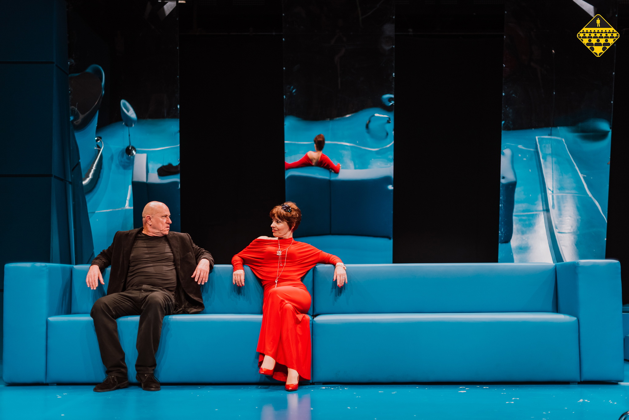 A Marosvásárhelyi Nemzeti Színház Kistermében az enyhén magasított emelvényre felépített díszlet egy szobabelsőt, egy trendi nappalit ábrázol, amelyet a szögletes és éles vonalak, valamint a kerek, íves formák barátsága tesz különlegessé. A fémből és műanyagból készült berendezés a high-tech stílust idézi. A színpadkép profizmust, magabiztosságot és gazdagságot sugall, ugyanakkor árad belőle a rideg személytelenség. Mintha egy lakótérnek álcázott filmstúdióban lennénk, és igaz is, hiszen a partikirálynő, vagy Bodolay szójátékával, „kultúr-kurva” Célimène (B. Fülöp Erzsébet) házában járunk, ahol a látszat a lényeg. Az élénk, hivalkodó türkizkék szín uralkodik, minden, még a padló is, türkizkék. Balról egy bárpult, a hozzá tartozó bárszékekkel és egy alacsonyabb forgószékkel, jobbról pedig egy kifutó zárja le a játékteret, a végében fehér lepellel letakart állványos mikrofon, mellette, a padlóra dobva, rongyos könyv hever, éles kontrasztot alkotva a letisztult vonalú, minimalista berendezéssel. Ebben a térben, ahová egy lazán a földre hajított e-könyv-olvasó nem keltene feltűnést, a nyomtatott könyv idegen testként hat. Szakadt lapjaiba bele-beleakad a színészek lába, egyértelműen kolonc, akadály, fölösleg. Mintha egyedül Alceste (Bíró József) tudná, hogy mire való: egyszer csak felveszi, lapozza, olvasni kezdi.