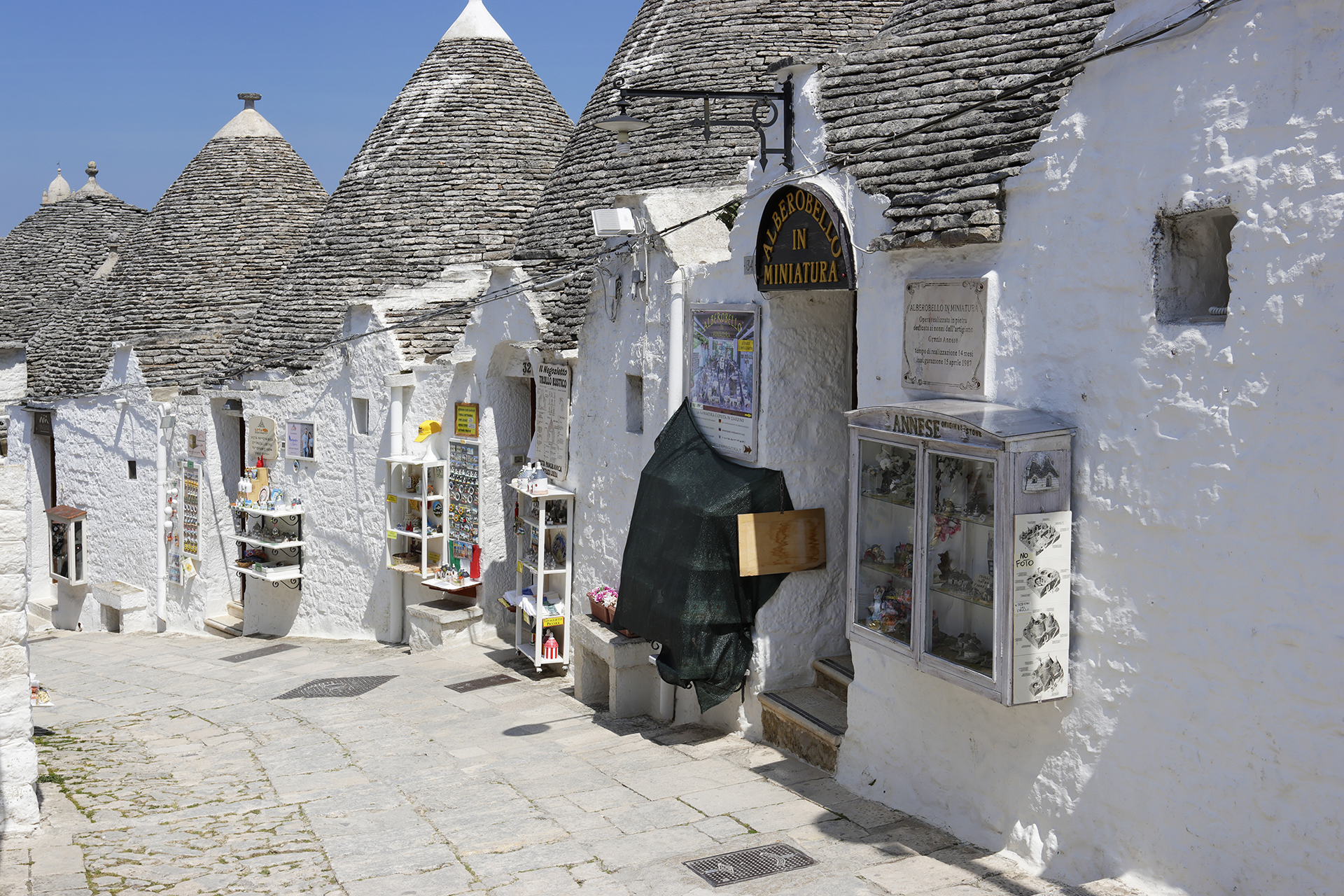 Alberobello számtalan kis boltjának tulajdonosa sikeresen kiaknázza a sáskajárást is lepipáló turistahadak szenzációhajhászatát és szelfimániáját: sok helyen többnyelvű tábla tájékoztat arról, hogy ingyenesen fel lehet menni az illető bolt tetőteraszára, némi vásárlás fejében. Így, az arcbőr vastagságától függően, kis palack víztől költséges giccsig terjedő portékával állhatunk a kasszához, hogy aztán megmászhassuk a tetőre vezető lépcsőt.