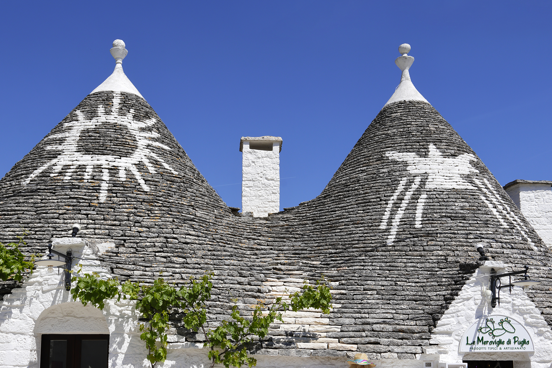 A trulli jellegzetes tetőszerkezetei amúgy is megérdemlik figyelmünket. Az utcák labirintusában sétálva érdemes felnézni nemcsak a számtalan különböző kémény és díszítőelem miatt, hanem azért is, mert a szürke kőlapokból kialakított kúpok csúcsán kézzel faragott, többnyire homokkőből készült díszeket is láthatunk. Ezek egymástól eltérő formája nem véletlen: a díszítőelemek az illető házat felépítő kőművesek cégjelzései, úgymond aláírásai.
